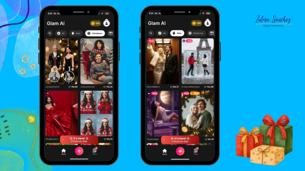 Glam AI es una aplicación que utiliza inteligencia artificial para generar retratos y sesiones fotográficas realistas en distintos estilos: elegante, fashion, profesional, navideño, urbano, etc.